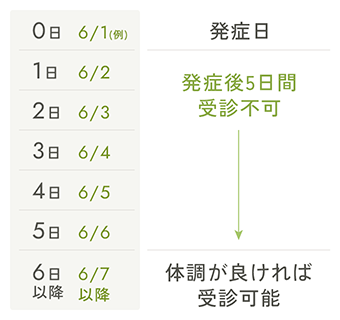 • 新型コロナワクチンを接種した方:接種後3日以上経過してから受診することを推奨いたします。副反応が起きた方は、体調が十分に回復してから受診することを推奨いたします。