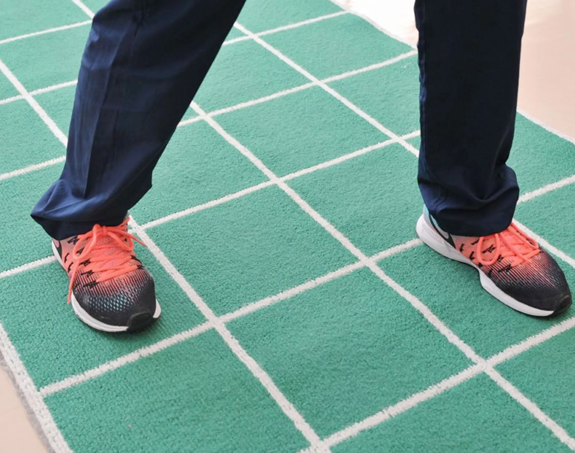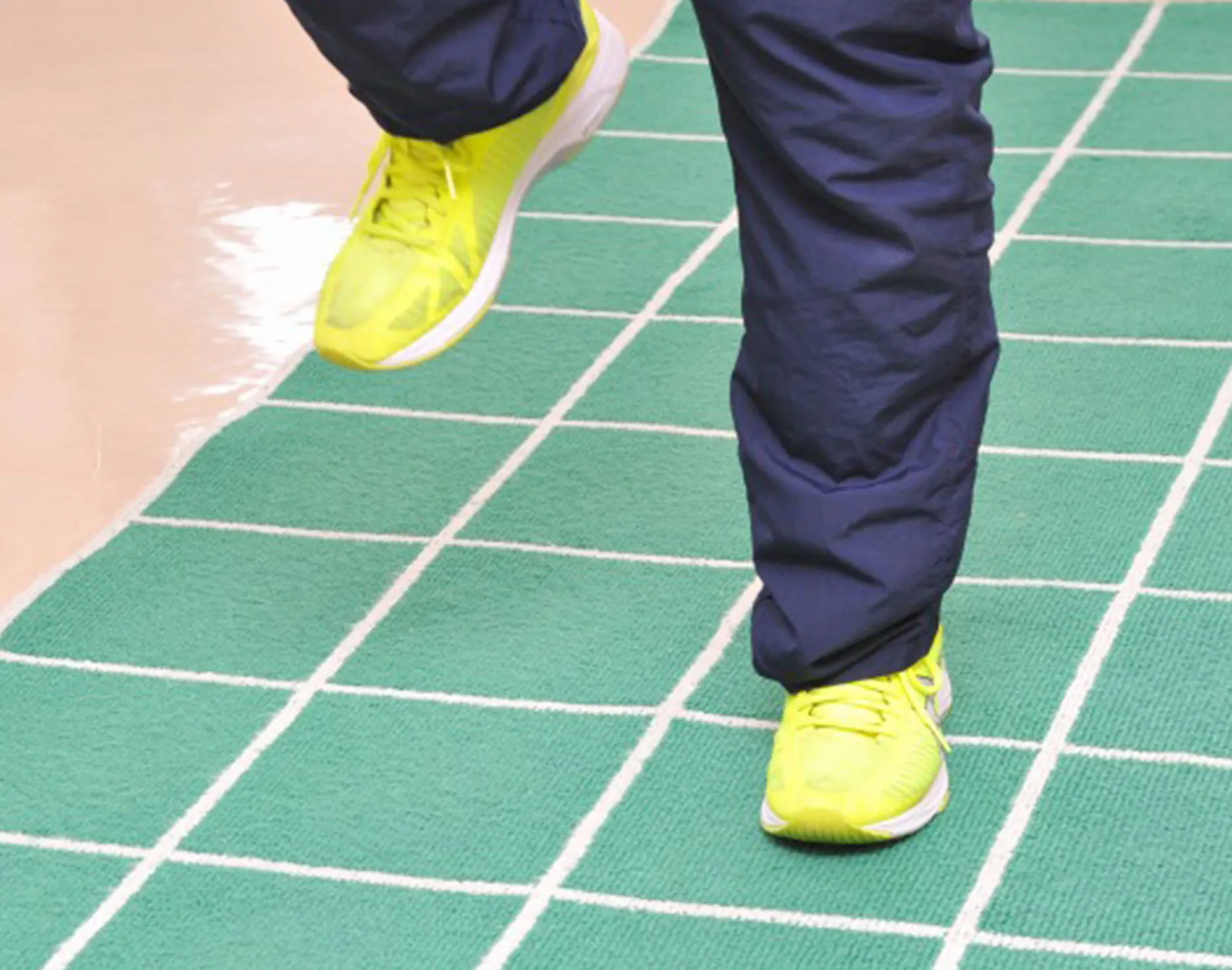 スクエアステップとは主に、バランス能力向上、転倒予防を目的とした運動です。横4マス、縦10マスのマス目が書いてあるマットの上を様々なパターン(前後左右に規則的に動く)で進んでいく運動です。実はこの運動、けっこう頭も使うので、認知機能向上にも効果があるんですよ。